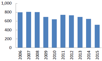 出口持續下滑,但降幅收窄。截止到2016 年5 月,我國紡織品累計出口額為432.15 億美元,同比下降0.5 個百分點,比去年同期的降幅低0.8 個百分點,也比第一季度的累計降幅低1.7個百分點。2016 年以來,紡織服裝業的出口仍保持下滑趨勢,但降幅有所縮窄,且低于整體出口的下降幅度。在經濟平穩運行的情況下,將目前的訂單情況考慮在內,紡織服裝業略有回暖,預計2016 年紡織服裝業出口將與2015 年基本持平。