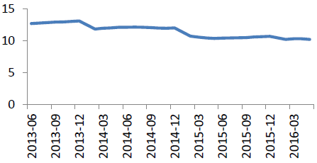2013-2016 年全國社會消費品零售總額分月累計同比增速(%)