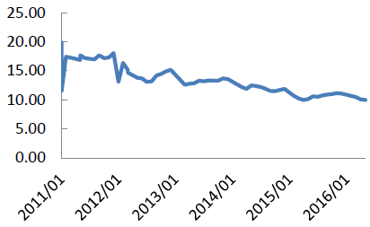 2011 -2016年全國社會消費品零售總額分月同比增速(%)