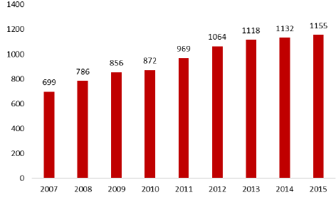 隨著人口老齡化、醫療保障制度的完善及居民收入水平的提高,我國藥品消費市場持續快速擴張。已由07年3600多億增長至14年12000多億,復合增長率達到19%,其中醫院端口14年消費總量為9600多億,07-14年復合增長率為21%,藥店端14年消費總量為2800多億,07-14年符合增長率為14%。由于體制和歷史沿革等因素影響,我國醫藥消費主要集中在醫院端口,藥店零售端只占消費總量22%左右。