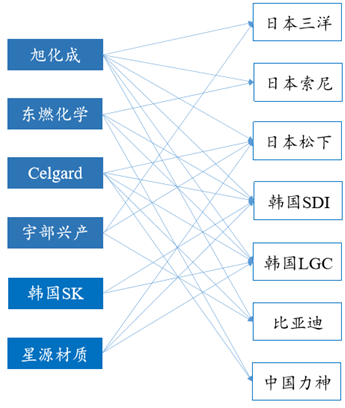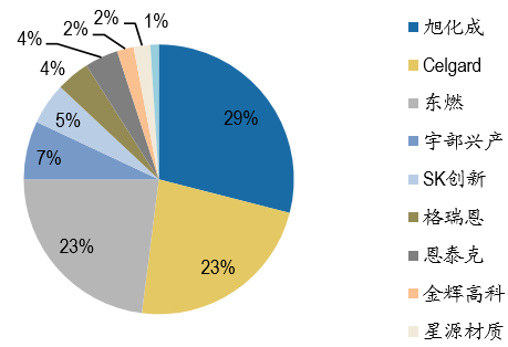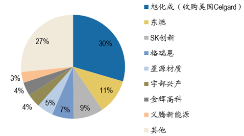 2015年,全球前三大鋰電隔膜企業日本旭化成、東燃化學和韓國SK三家公司依靠技術優勢分別占據全球30%、11% 和9%市場份額,產量均超過1億m2,壟斷50%以上市場份額,全球前列的公司大都以高端隔膜業務為主,競爭力強;中國以及其它日韓企業 由于技術壁壘和渠道限制很難形成大規模銷售。未來能夠形成的競爭力也將是那些 以高端隔膜業務為主、成功進入中高端鋰電公司產業鏈的企業,這些企業將在隔膜市場平分秋色,直到下一輪新技術革新。
