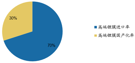目前,國內高端動力鋰電池隔膜仍然供不應求,雖然國內外產品差距在不斷縮 小,但趕超空間仍然巨大。據公開資料顯示,高端隔膜進口率達70%,隔膜超過40% 依靠進口,動力鋰膜環節的進口替代空間仍然非常巨大。