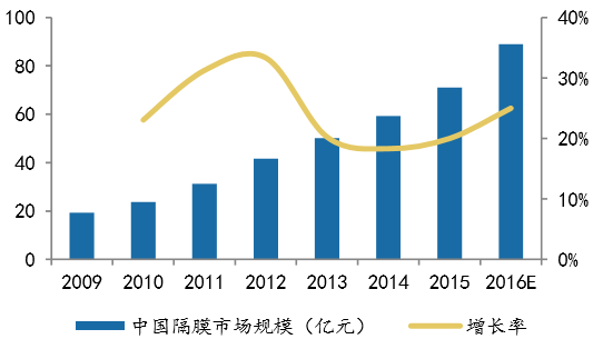 2009年中國隔膜市場規模為19.34億元,預計到2016年,隔膜市場規模將增長至89億元。其中,國產鋰電隔膜市場規模也在不斷增大,2009年產值規模為5.12億 元,但是增長速度從2012年起大幅下滑,受價格下降影響,2014年產值為20.5億元, 同比增增速下滑至15%。隨著國內產能的快速釋放,國產隔膜質量的提升以及價格邊際下降的趨勢放緩, 預計2016年產值規模將突破40億元。