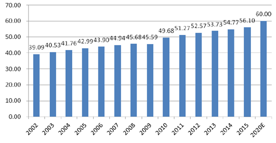 2002 年到2015 年,我國城鎮化率由39.09%提高到56.10%,年均提高約1.31 個百分點。根據國家人口計生委發布《中國流動人口發展報告2012》,預計到2020 年城鎮化率為60%左右,未來十年全國城鎮人口年均增加1,300 萬-1,600 萬,其中,農村轉移人口1,000 萬-1,300 萬。按此預計,到2020 年我國城鎮人口將超過8 億人。