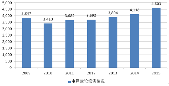 我國電網基本建設和投資維持較高水平,2009 年-2015 年六年間,電網基本建設投資累計到27,247 億元。