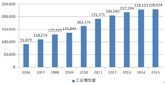 工業領域歷來是用電大戶,是斷路器重要應用領域之一。盡管近年來在國家節能減排政策的驅動下,煉鐵、煉鋼、焦炭、水泥等工業行業中一批產能落后的企業逐步被淘汰,工業增加值增速趨緩,但工業增加值絕對值仍穩步上升,工業增加值從2006 年91,079 億元達到2015 年228,974 億元,復合增長率為10.79%。