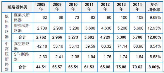 2008 年-2014 年間,低壓斷路器年產量從2,762 萬臺增加到5,708 萬臺,復合增長率高達12.86%;中高壓斷路器從年產44.51 萬臺增加到70.62 萬臺,復合增長率達8.00%。我國斷路器行業近年來保持良好穩定的發展勢頭。2008年-2014 年斷路器產量及增長情況如下: