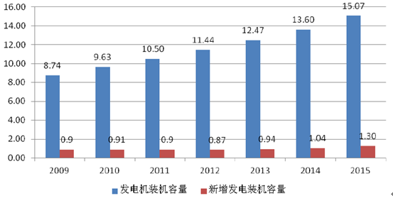 為緩解電力供應緊張的局面,在中央和地方政府的推動下,電力建設大規模展開。2009 年我國發電裝機容量為87,407 萬千瓦,到2015 年我國發電裝機容量已達到150,673 萬千瓦,復合增長率達9.50%。為滿足持續增長的用電需求,“十三五”期間我國將繼續加強電力工業建設。根據《國家電網報》公布“十三五”電網發展規劃研究成果,預計2020 年全國發電裝機總量20.7 億千瓦,相比2015 年新增5.63 億千瓦,復合增長率6.55%。