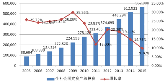 斷路器被廣泛應用與國民經濟的各個行業,斷路器及其關鍵部件的需求受各行業投資的驅動,與全社會固定資產投資情況聯系密切。2005 年-2015 年全社會固定資產投資增長迅速,其中2015 年全社會固定資產投資562,000 億元,年復合增長率約20.29%。2001 年-2015 年全社會固定資產投資情況如下: