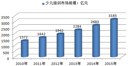 指標總人口0-14歲人口少兒人口占比2003年1292272855922.10%2004年1299882794721.50%2005年1307562650420.27%2006年1314482596119.75%2007年1321292566019.42%2008年1328022516618.95%2009年1334502465918.48%2010年1340912225916.60%2011年1347352216416.45%2012年1354042228716.46%2013年1360722231616.40%2014年1367822395717.51%近年來國內經濟水平的不斷提高,家庭收入持續增長,,少兒培訓行業蓬勃發展,每年以超過15%的速度增長,到2015年,少兒培訓市場規模超過3000億元。同時,無論是城市還是農村,對子女教育的認識逐漸提高,加上社會競爭激烈,人們更愿意增加少兒教育方面的支出。少兒受教育的年齡也因此逐漸提前,成為推動少兒藝術培訓市場發展的重要因素。