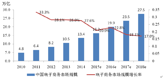 中國經濟發展“電商化”趨勢日益明顯,網絡交易量直線上升,電子商務已在深刻影響傳統IT 市場和傳統產業。基于互聯網的融合發展新模式、新業態不斷涌現,電子商務在推動中國經濟發展、助力結構轉型的過程中發揮著越來越重要的作用。根據統計,2015 年中國電子商務市場交易規模16.2 萬億元,比2014 年增長20.9%;根據艾瑞資訊預測,2018 年我國電子商務市場將達到27.5萬億元,比2014 年增長96.75%。