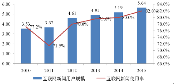 根據相關統計數據,截至2015 年12 月,我國通過互聯網獲取新聞信息的用戶數已經達到5.64 億,同比增長8.8%。隨著我國互聯網行業的快速發展,互聯網用戶規模迅速擴大,瀏覽網絡新聞的用戶數量也隨之增長,網民逐漸養成通過網絡獲取新聞信息的使用習慣,2015 年12 月我國互聯網新聞的使用率達到82.0%,排在各類互聯網應用使用率的第三位。