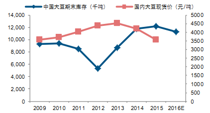 從庫存角度看,中國大豆的期末庫存量與國內大豆價格呈負相關關系,在大豆期末庫存處于低位時期,國內大豆價格處于上升通道,當大豆庫存開始回升時,大豆價格則呈下降趨勢,因此我們認為,2016年國內大豆期末庫存的減少將在一定程度上對大豆價格的上漲形成支撐。
