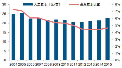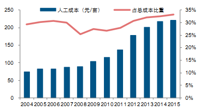 人工成本是中美成本結構中差距最大的,這也主要是由于美國機械化程度較高,在大豆生產中投入的人工相對較少,且在總成本中所占比例呈逐年下降的趨勢,2004—2015 年由 7.29%降低到 4.64%;而中國在城鎮化發展中,農業勞動力結構化缺失促使勞動力價格迅速上漲,從而導致中國大豆人工成本快速上升。