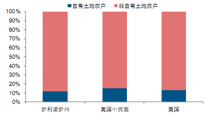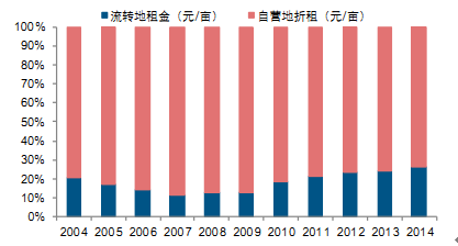 中國土地成本增速超過美國,2004—2015 年,中國土地成本年均復合增速高達13.3%,而美國僅為 3.4%。2009 年以前,中國土地成本低于美國,到 2009 年中國土地成本首次超過美國并且差距越來越大。中美土地成本差異的原因主要由于兩國土地制度的不同,中國土地成本中自營地折租占主體地位,而美國目前 90%左右的土地非自有,絕大多數農民都是租地種田。