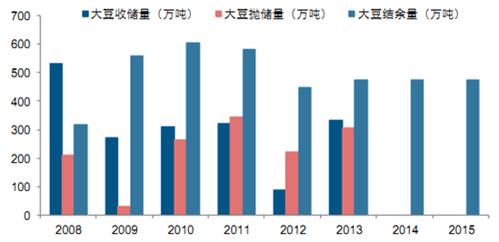 從歷史上看,在 2012 年大豆出現產需缺口的情況下,大豆價格始終處于高位,盡管國家多次拋儲,并在 2012、2013年分別拋儲 221 萬噸和 305 萬噸,但并未改變大豆價格處于高位的現狀,雖然國儲大豆投放一定程度上增加了市場供給,但所投放的儲備大豆并未明顯改善產需缺口。