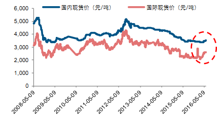 中國大豆對外依存度接近 90%,是高度國際化的農產品,國內外市場聯動性較強。在2016 年全球大豆產需出現缺口的情況下,國際大豆價格開始止跌回升;國內方面,經歷了大豆連續多年減產的同時需求穩步提升,產需缺口巨大,只能通過大量進口彌補,國內外市場共同走強將有望帶動國內大豆價格上漲。因此,預計 2016 年大豆現貨價均價為 3600 元/噸,高點落在 4000—4200 元/噸。