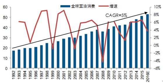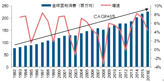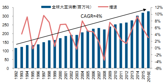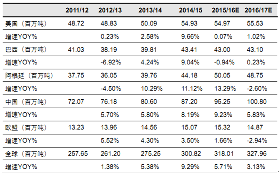 自 1992 年以來,全球大豆需求穩(wěn)步提升,消費(fèi)量由 1992 年的 1.16 億噸上漲到 2015年的 3.01 億噸,年復(fù)合增速 4%。在中國等發(fā)展中國家蛋白需求剛性增長的帶動下,預(yù)計未來全球大豆消費(fèi)量仍將保持增長態(tài)勢,15/16 年度全球大豆消費(fèi)總量將達(dá)到 3.18億噸,同比增長 5.65%。