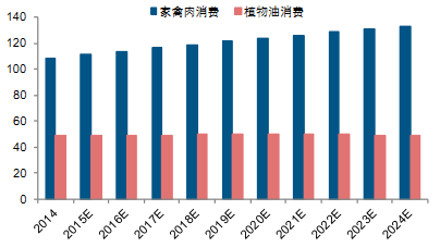從細(xì)分領(lǐng)域來看,未來全球大豆消費(fèi)的增長主要來源于蛋白消費(fèi)的增長,預(yù)計 2024 年家禽肉的消費(fèi)量將達(dá)到 1.33 億噸,自 2014 年以來年復(fù)合增速 2%,而植物油的消費(fèi)預(yù)計在未來 10 年內(nèi)略有增長。