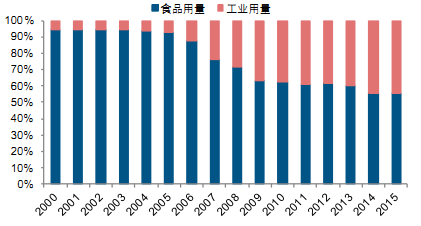 大豆消費(fèi)主要用于壓榨,自 2000 年以來,全球大豆壓榨量占消費(fèi)的比重始終在 85%以上,2015 年全球大豆壓榨量為 2.79 億噸,在消費(fèi)量中占比為 87.82%,每一噸大豆可以壓榨出大約 0.18 噸的豆油和 0.8 噸的豆粕。