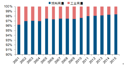 豆粕作為一種高蛋白質(zhì)原料,主要是用作牲畜與家禽飼料的主要原料,近些年水產(chǎn)養(yǎng)殖對豆粕的消費(fèi)需求也呈快速增長態(tài)勢。在豆粕主要消費(fèi)國中,中國豆粕主要用于飼料和工業(yè),其中 2015 年豆粕飼料用量為 6196 萬噸,工業(yè)用量為 102 萬噸;歐盟 2015 年豆粕的飼料用量為 3120 萬噸,而工業(yè)用量只有 1 萬噸,食品用量也僅 3.2 萬噸;美國和巴西則完全用于飼料業(yè)。