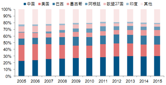 隨著全球蛋白的需求剛性增長,全球大豆消費(fèi)也保持穩(wěn)健增長,1992 年到 2015 年,全球大豆消費(fèi)年復(fù)合增速達(dá)到 4%。國別結(jié)構(gòu)上,大豆主要生產(chǎn)國也即大豆消費(fèi)的主力軍,其中,中國是全球最大的大豆消費(fèi)國。預(yù)計 15/16 年度全球大豆消費(fèi)總量達(dá)到 3.18 億噸,同比增長 5.65%,其中,中國和美國消費(fèi)量分別為 9525 萬噸和 5470 萬噸,占比分別為 29.94%和 17.19%,巴西和阿根廷占比 29.25%。