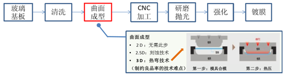 目前 3D 玻璃生產(chǎn)的工藝主要有:開料、CNC、研磨拋光、烘烤、鍍膜、熱彎等,其中熱彎工藝是最為關(guān) 鍵,制約著良品率的高低。目前國(guó)內(nèi)用于生產(chǎn) 3D 曲面玻璃的熱彎?rùn)C(jī)主要以進(jìn)口韓國(guó)設(shè)備為主,價(jià)格在 120-180 萬,月產(chǎn)能在 1.5 萬片左右,遠(yuǎn)不能滿足市場(chǎng)需求。