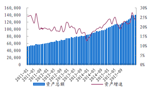 2011-2015年中國保險行業資產總額(億元)及增速