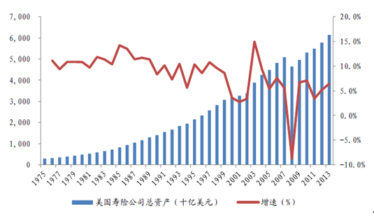 1975-2013年美國壽險公司總資產及增速