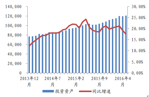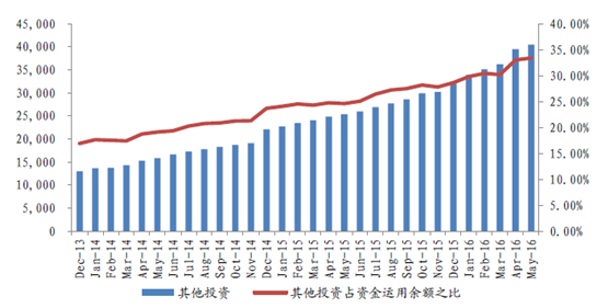 截止2016年5月,行業總體資金運用余額超過12萬億元,其中其他投資占比33.41%,所占可投資產比例持續創新高。由于目前尚未披露其他投資的具體科目,但從其他幾項資產的界定,銀行存款、債券和股票基金基本可以認為是保險公司最傳統的配置,因此可以先將其他投資的增長當做保險公司對另類資產的配置。就目前的趨勢來看,其他投資的占比和配置情況正在逐步向上,這意味著另類投資規模也潛在增長。