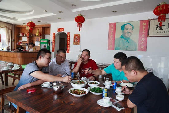 賀軍與侄子在他開在大望村的餐館里吃午飯(左一、左三、左四依次為賀背、賀軍、賀熊)