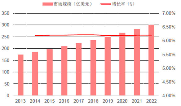 全球軍工通信市場正處于穩健擴張階段。得益于世界各國對軍工通信系統建設的重視,2013 年全球軍工通信市場規模達到174.6 億美元,2022年市場規模有望迅速增長至300 億美元以上,年復合增長率達6.2%。