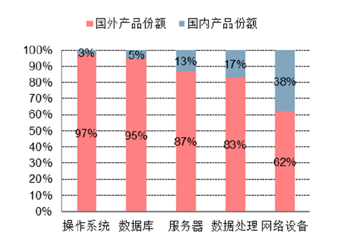 1、信息安全核心軟硬件自主化程度低。據相關機構統計,在130萬套核心軟硬件設備中,國外產品占據60%以上份額。思科幾乎壟斷中國大型網絡建設項目,涵蓋軍警、政府、海關、鐵路等國防核心部門;數據庫市場中Oracle、IBM和微軟位居市場份額前三。“舶來品”對核心組件的壟斷對國防信息安全構成了嚴重威脅。