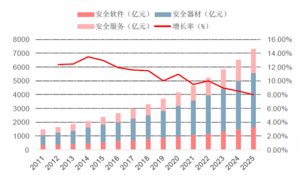 1、中國正大幅加速國防信息安全建設。面對國防信息安全的嚴峻局勢,本世紀伊始中國決策層已對信息安全問題有所察覺,并開始從需求和供給兩方面出臺系列政策以加強信息安全建設。2014年2月27日,中央網絡安全和信息化領導小組宣告成立,標志著信息安全已經上升至國家戰略高度,國防信息安全建設有望大幅提速。我們預測,中國信息安全市場規模將由2015年的2367億元增長至2025年的7320億元,十年增長兩倍,復合增長率達11%。