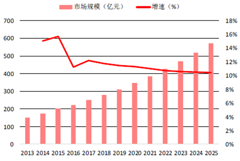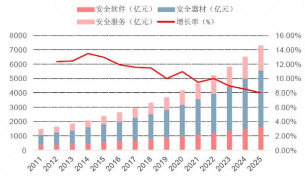 中國正大幅加速國防信息安全建設。面對國防信息安全的嚴峻局勢,本世紀伊始中國決策層已對信息安全問題有所察覺,并開始從需求和供給兩方面出臺系列政策以加強信息安全建設。2014年2月27日,中央網絡安全和信息化領導小組宣告成立,標志著信息安全已經上升至國家戰略高度,國防信息安全建設有望大幅提速。我們預測,中國信息安全市場規模將由2015年的2367億元增長至2025年的7320億元,十年增長兩倍,復合增長率達11%。