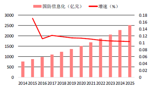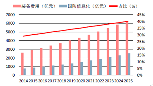 2016-2025年中國國防裝備費用及國防信息化占比預測