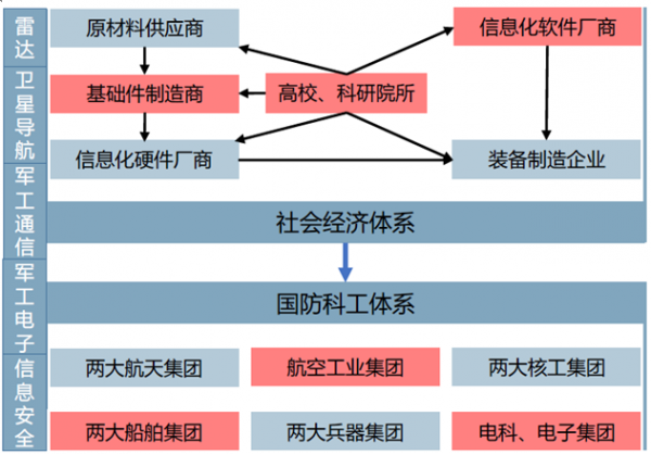 政策名稱時間簽發機構主要內容軍隊建設十三五規劃綱要2016年中央軍委信息化建設取得重大進展,構建能夠打贏信息化戰爭、有效履行使命任務的中國特色現代軍事力量體系十三五規劃綱要2016 年中共中央到2020年,基本完成國防和軍隊改革目標任務,基本實現機械化,信息化取得重大進展,構建能夠打贏信息化戰爭、有效履行使命任務的中國特色現代軍事力量體系中國的軍事戰略2015 年國務院根據戰爭形態演變和國家安全形勢,將軍事斗爭準備基點放在打贏信息化局部戰爭上,加快武器裝備更新換代,構建適應信息化戰爭和履行使命要求的武器裝備體系十八大報告2012 年中共中央深入開展信息化條件下軍事訓練,增強基于信息系統的體系作戰能力2010年國防白皮書2011 年國務院2020年基本實現機械化并使信息化建設取得重大進展,強調信息化條件下聯合作戰理論、體系與軍事訓練2008年國防白皮書2009 年國務院國防和軍隊信息化是國防和軍隊現代化建設“三步走”發展戰略主要組成部分之一;開展復雜電磁環境下訓練,立足打贏信息化條件下的局部戰爭軍民兩大體系助推國防信息化產業發展。中國軍工體系分為國防科工體系和社會經濟體系,兩大體系相互融合助推國防信息化產業發展。國防科工體系主要由十大軍工集團組成,負責重點軍工型號的總體研發和整機制造,構成產業鏈的下游;社會經濟體系由裝備制造企業、原材料供應商、基礎件制造商、高校/科研院所、信息化硬件廠商、信息化軟件廠商組成,構成產業鏈的上游。兩大體系共同實現了對雷達、衛星導航、軍工通信、軍工電子及信息安全五大細分領域的全面覆蓋,助推國防信息化產業加速發展。