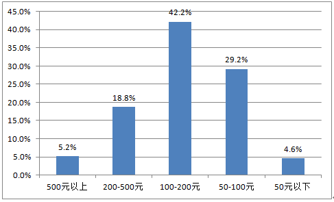 2016Q1中國(guó)上門美業(yè)O2O用戶單次服務(wù)消費(fèi)平均價(jià)格分布