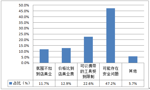 47.2%中國(guó)手機(jī)網(wǎng)民認(rèn)為之所以不選擇上門美業(yè)服務(wù),最大顧慮因素為安全問(wèn)題。其次是考慮到上門美業(yè)服務(wù)可以攜帶的工具會(huì)受到限制,從而影響服務(wù)質(zhì)量。用戶對(duì)上門服務(wù)的安全考慮非常敏感,行業(yè)內(nèi)各服務(wù)提供商需要對(duì)美業(yè)師需進(jìn)行嚴(yán)格的篩選,從而減少安全事故的發(fā)生,贏得用戶信任。