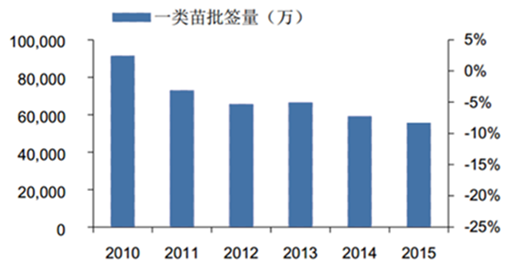 2010-2015年國內(nèi)一類疫苗總批簽量