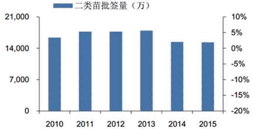 2010-2015年國內(nèi)二類疫苗總批簽量