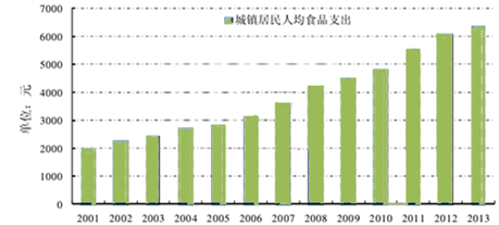 2001 年~2013 年我國城鎮居民人均食品支出金額