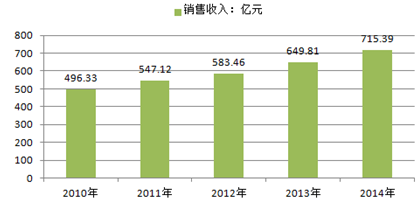 2010-2014年我國速凍食品制造業銷售收入總額(億元)