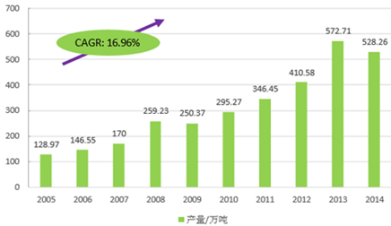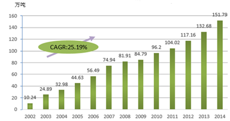 2002 年以來,速凍魚糜制品產量高速增長,至 2014 年已達 151.79 萬噸,