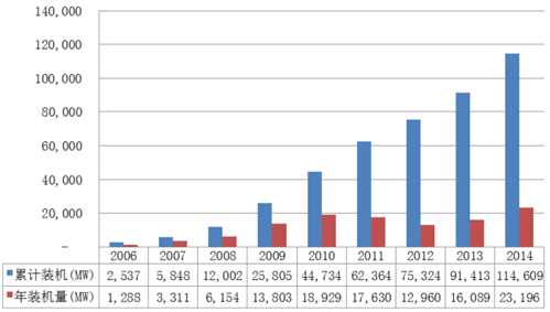 2006年至2014年我國風電總體新增及累計風電裝機容量統計圖