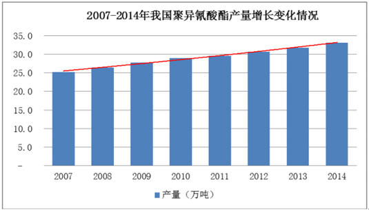 國內 MDI 產量逐年提高,市場供應充足,從而聚異氰酸酯的產量也呈逐年增長的態勢, 2014年我國聚異氰酸酯的產量達到 33.10萬噸。