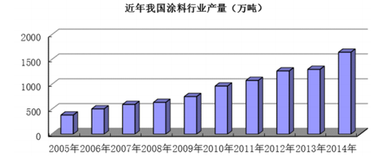 2003 年至 2008 年,我國涂料總產量一直居世界第二,僅次于美國。2009年我國涂料總產量躍居世界第一,達到755.44 萬噸。我國涂料總產量 2013 年達到 1,303 萬噸,2014 年達到1,648.19萬噸。根據預測,我國涂料產量在未來若干年內仍將維持較快增長速度,推動涂料市場增長的因素主要包括:汽車涂料的消耗預計將隨著我國汽車產業(yè)的持續(xù)發(fā)展繼續(xù)保持較快速的增長速度; “十二五”投資項目正進入集中建設階段, 新型城鎮(zhèn)化建設仍將使未來我國經濟保持較快增長勢頭,將會拉動涂料市場的剛性需求的增長;保障性住房的大批量入市將催生新的市場熱點;我國人均涂料用量與發(fā)達國家相比仍落后較多,增長空間巨大。有機顏料是組成涂料中的主要著色物質之一, 其市場規(guī)模將隨著