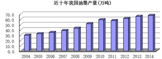 改革開放以來,我國油墨行業(yè)獲得了跨越式發(fā)展。2010 年全國油墨總產量達到 59 萬噸,相比 2000年 18 萬噸增長了 2 倍多,首次超過德國、日本,僅次于美國,位列世界第二大油墨生產國,約占全球油墨生產規(guī)模的14%;2013 年我國油墨產量為 65.6 萬噸,比2012年增長了6.5%; 2014年我國油墨產量為67.2萬噸, 比2013年增長了2.4%。我國油墨制造工業(yè)快速發(fā)展的主要驅動因素包括兩個方面: 隨著國民經濟持續(xù)高速發(fā)展和人民生活水平的提高,各行業(yè)對印刷產品的需求量迅速擴大,國內印刷市場的大發(fā)展直接拉動油墨制造工業(yè)步入了快速發(fā)展時期;同時,隨著經濟全球化的加深, 全球著名的油墨制造商自 20 世紀 80 年代末就開始向我國投入資金和技術,建立生產基地并擴大其產品市場,使我國油墨產業(yè)結構經歷了變革,產品結構得到了調整和創(chuàng)新,提高了油墨的產能。