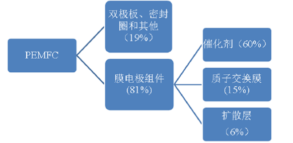 PEMFC 雖然在性能上適合車用,但其成本仍然偏高。一個質子交換膜燃料電池主要由膜電極組件(MEA)、雙極板和密封圈組成。而膜電極是其中關鍵部件組件,它由質子交換膜、催化劑以及擴散層組成。催化劑目前主要用的是鉑金,占燃料電池堆總成本的60%,這是PEMFC 成本居高不下的主要原因。