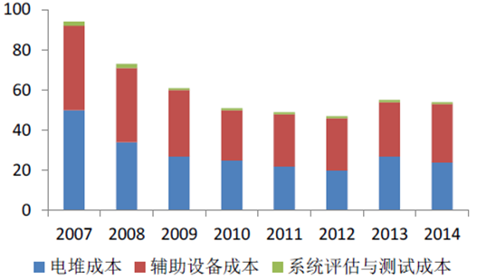 燃料電池系統成下降曲線($/KW)